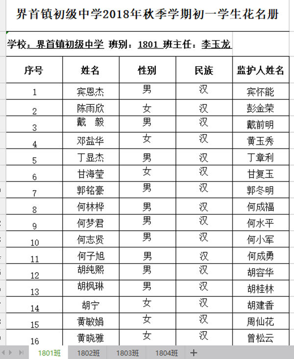 附件:界首镇初级中学2018年秋季学期新生录取名单