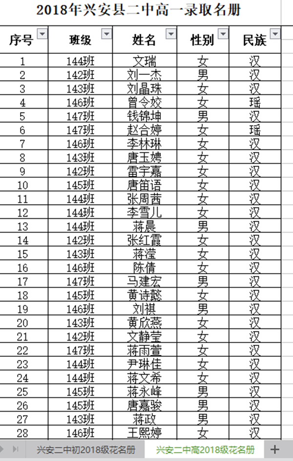 附件:兴安县第二中 学2018年秋季新生录取名单