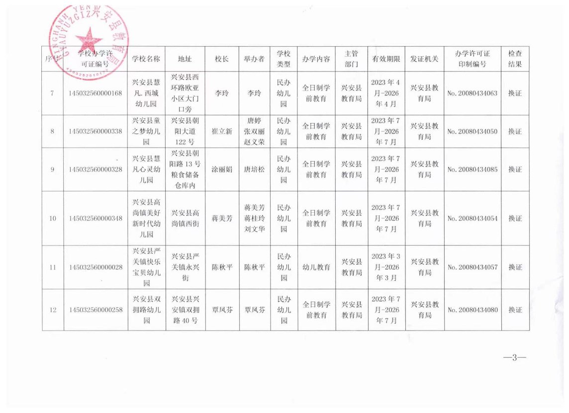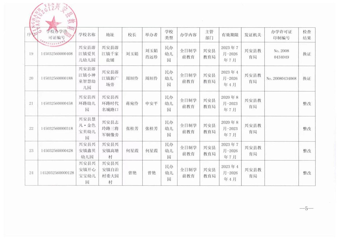 关于公布兴安县2023年民办幼儿园办学许可证到期换证的检查结果的通知