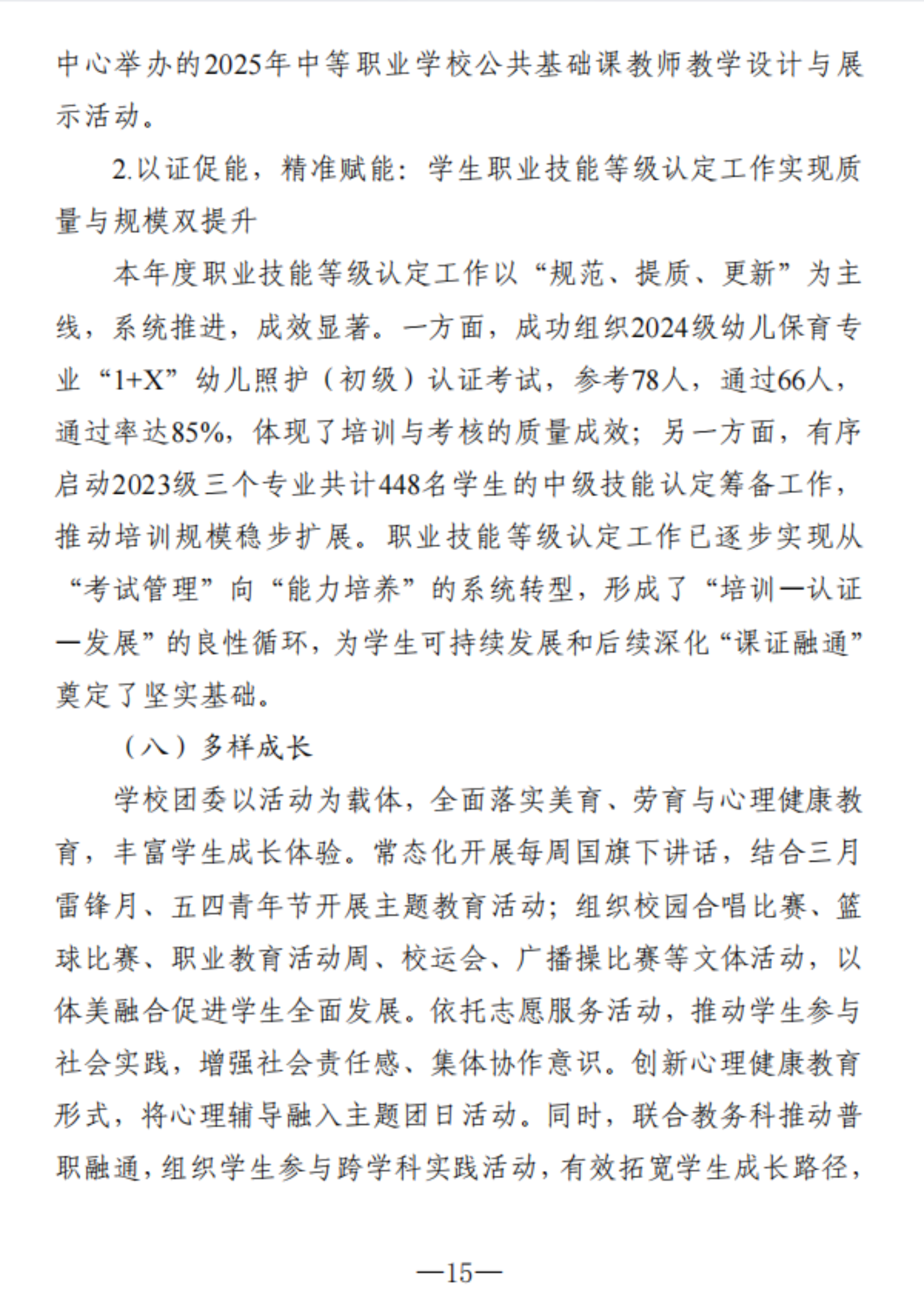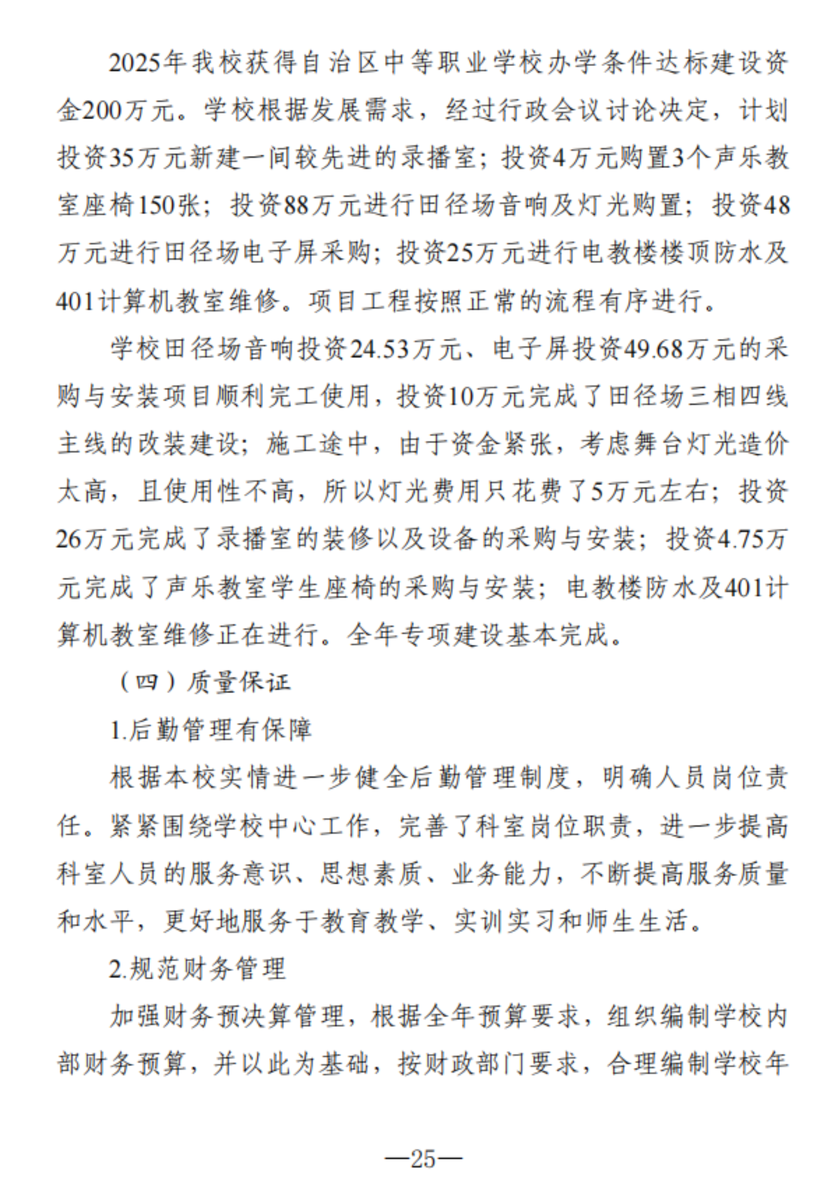 根据教育部和自治区教育厅关于做好2025年职业教育质量年度报告编制、发布和报送工作的通知要求,为全面展示学校一年来的办学成果,学校高度重视,在充分调研分析和认真总结提炼学校各方面工作的基础上,严把质量关、内容关、程序关,高质量编制了2025年质量年报,现向社会公布。
