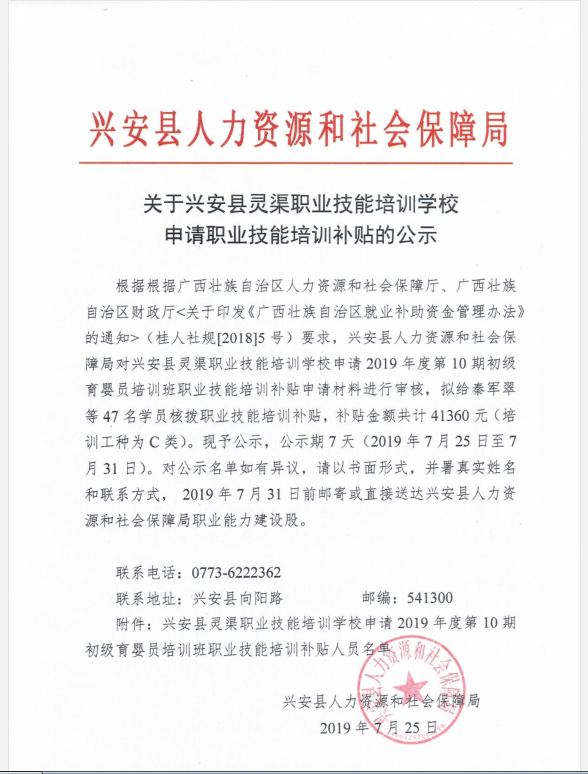 关于兴安县灵渠职业技能培训学校申请职业技能培训补贴的公示(2019年第10期)