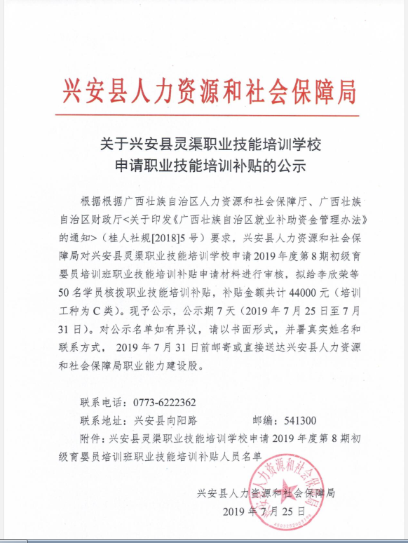 关于兴安县灵渠职业技能培训学校申请职业技能培训补贴的公示(2019年第8期)
