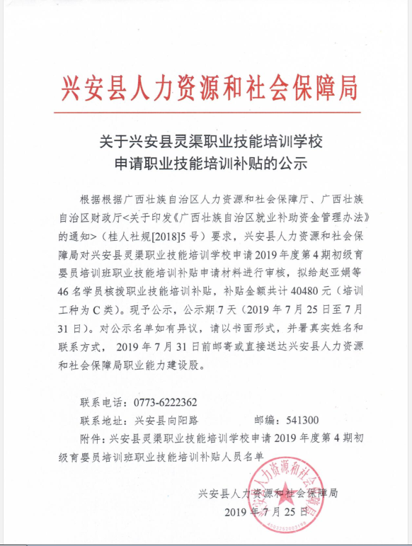 关于兴安县灵渠职业技能培训学校申请职业技能培训补贴的公示(2019年第4期)