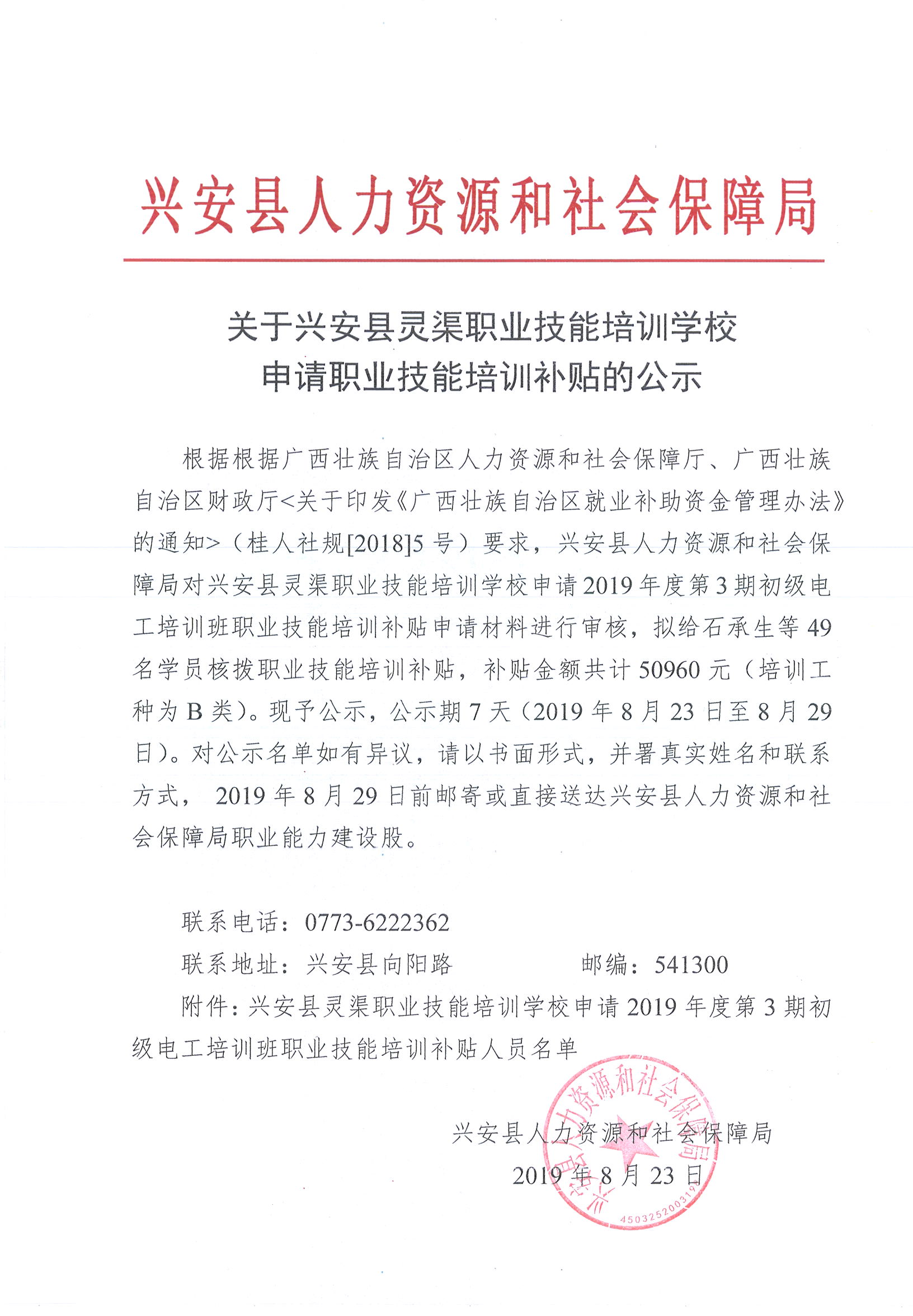 关于兴安县灵渠职业技能培训学校申请2019年第3期初级电工培训班职业技能培训补贴的公示