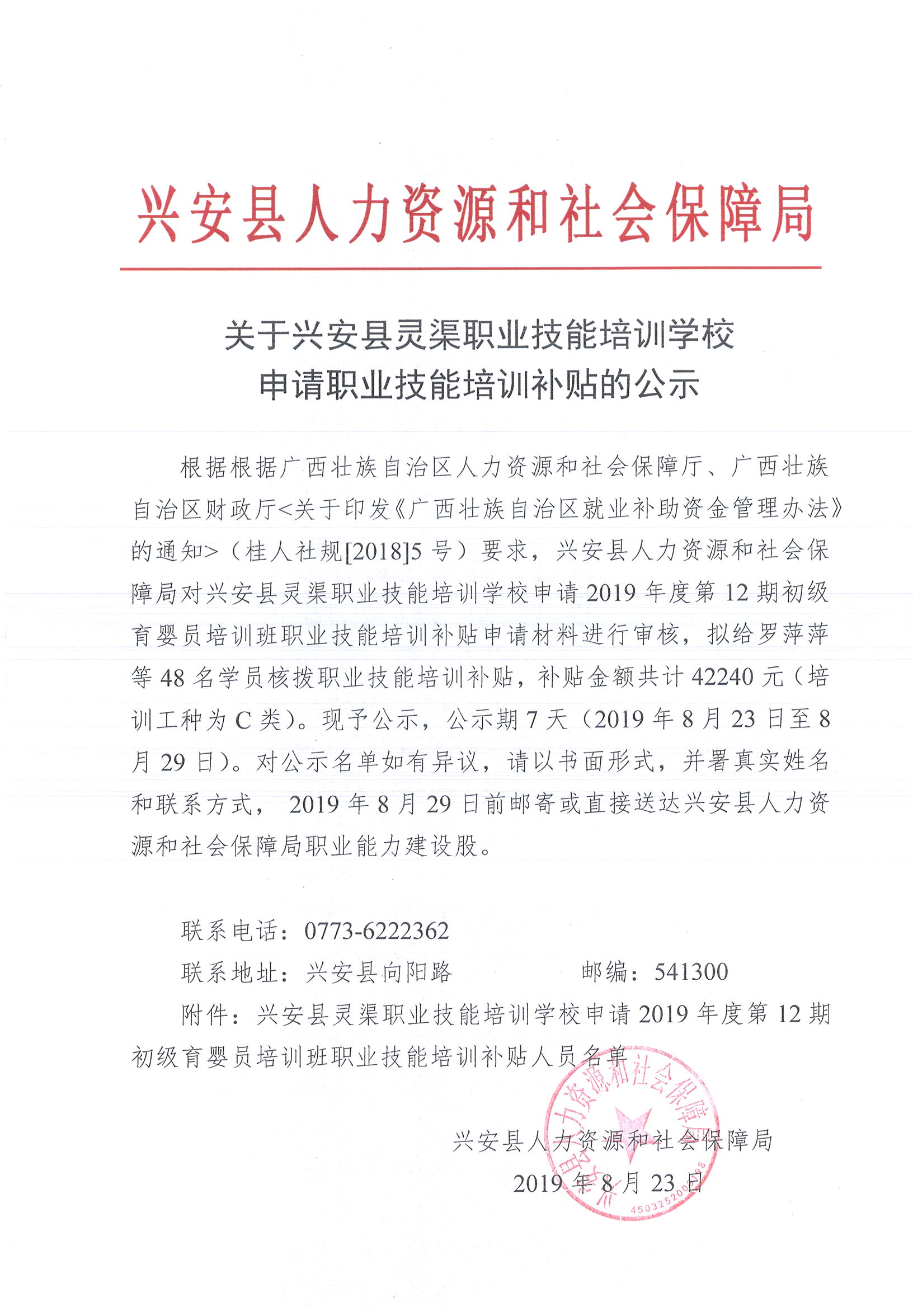 关于兴安县灵渠职业技能培训学校申请2019年第12期初级育婴员培训班职业技能培训补贴的公示