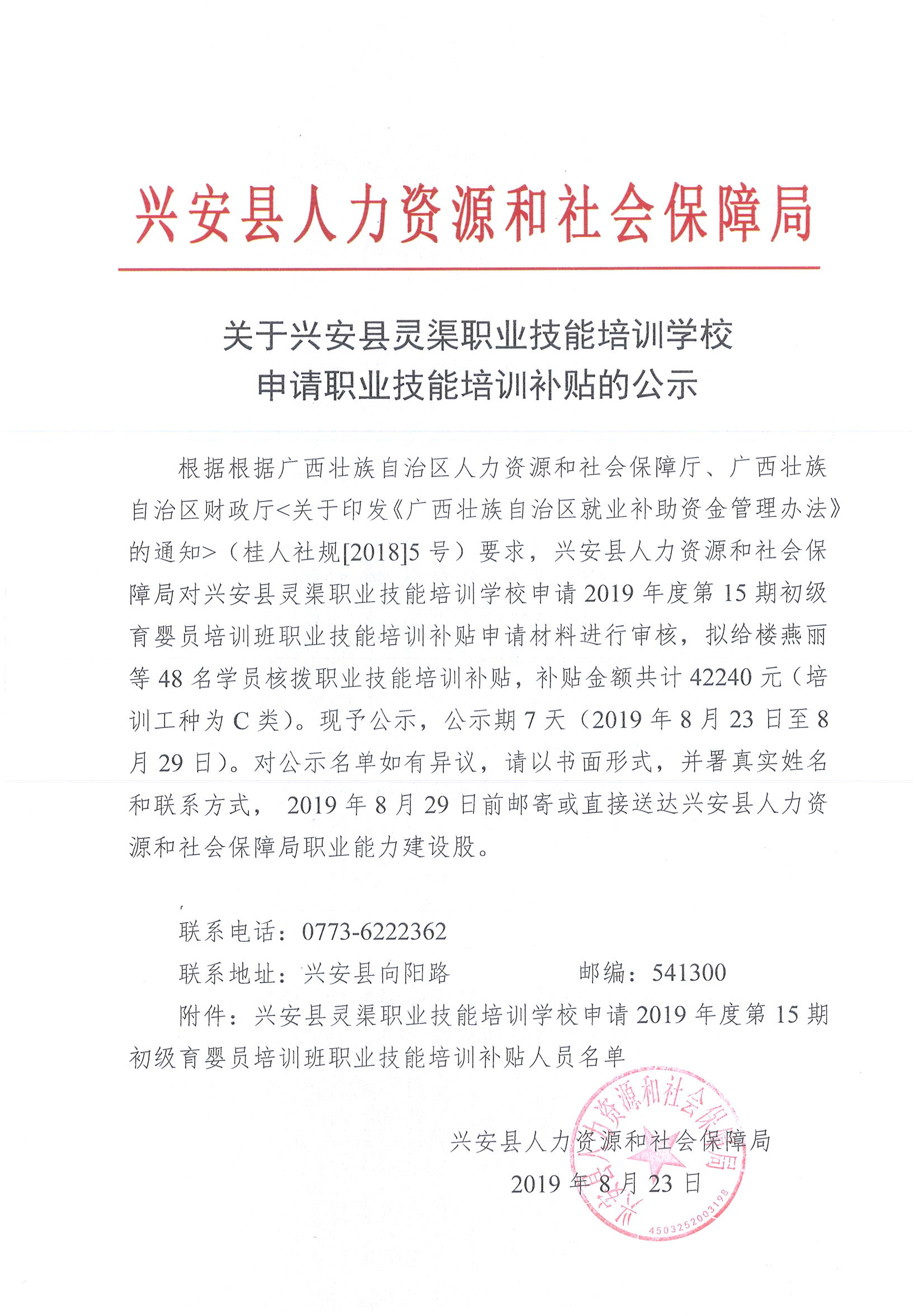 关于兴安县灵渠职业技能培训学校申请2019年第15期初级育婴员培训班职业技能培训补贴的公示