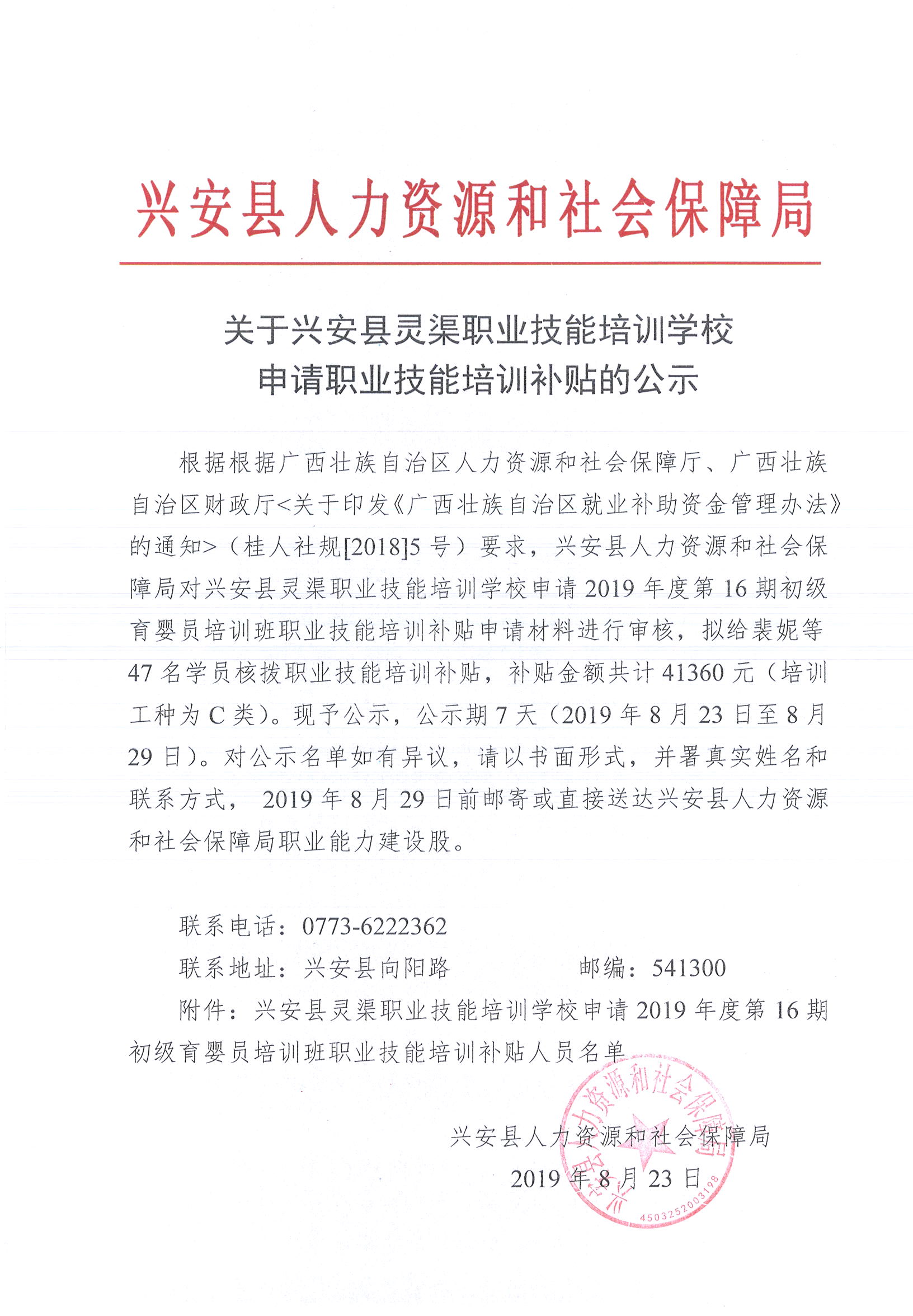 关于兴安县灵渠职业技能培训学校申请2019年第16期初级育婴员培训班职业技能培训补贴的公示