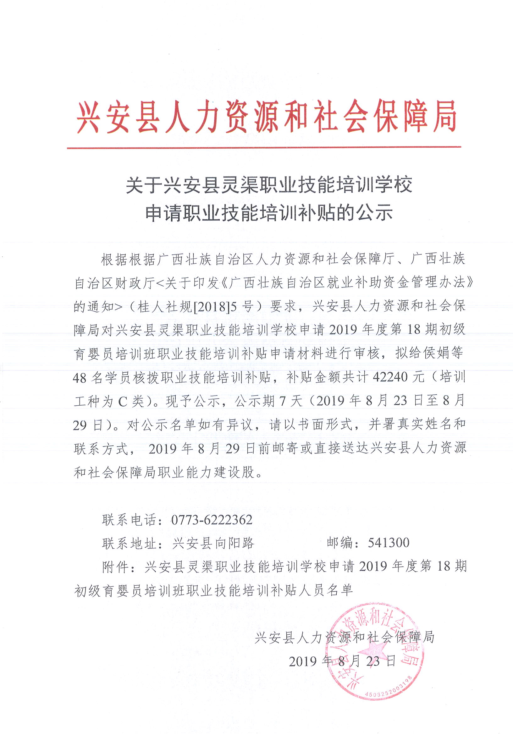 关于兴安县灵渠职业技能培训学校申请2019年第18期初级育婴员培训班职业技能培训补贴的公示
