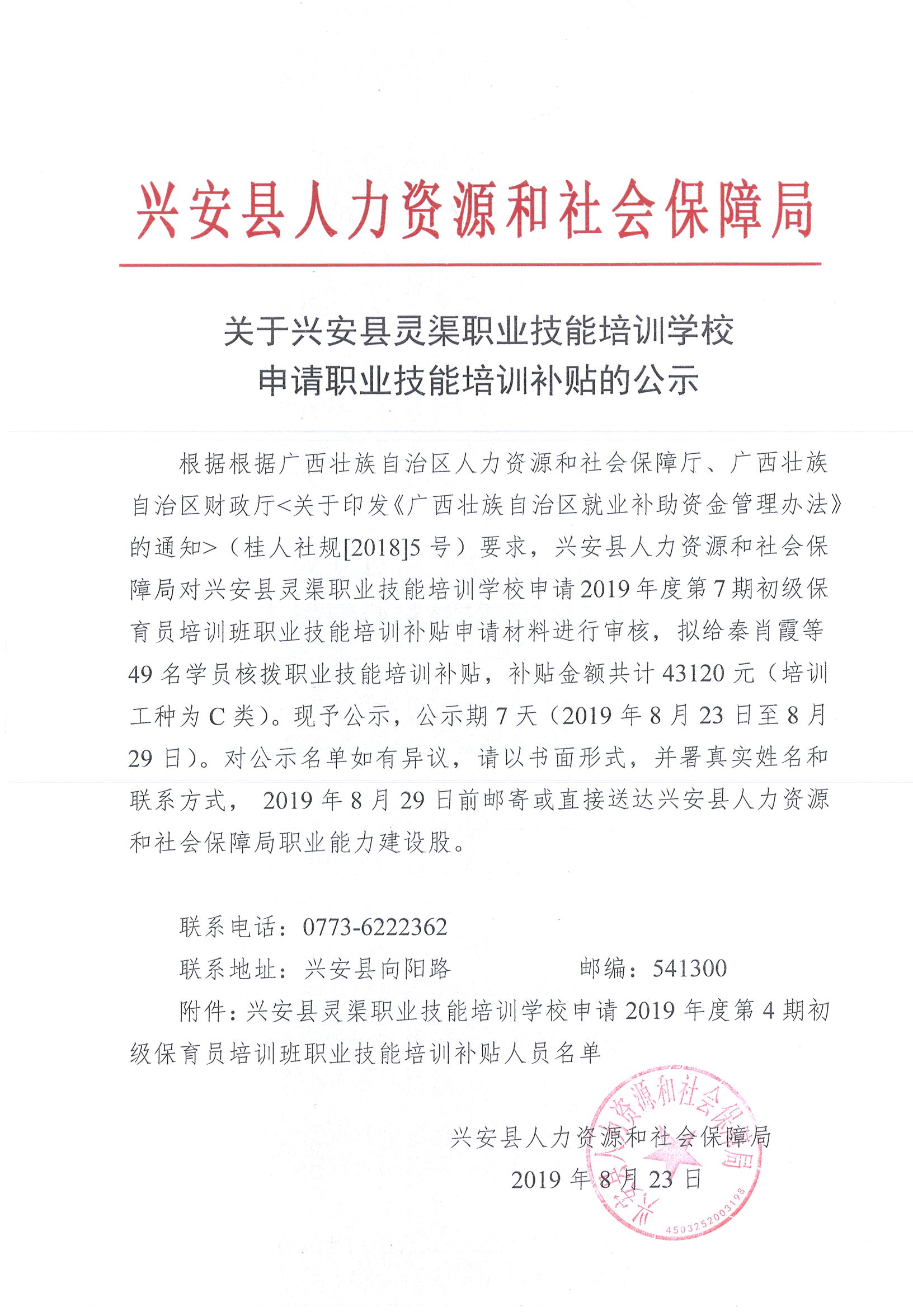 关于兴安县灵渠职业技能培训学校申请2019年第7期初级保育员培训班职业技能培训补贴的公示