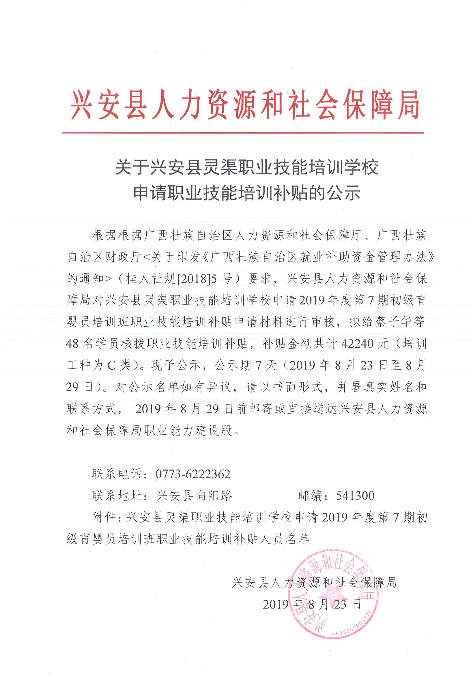 关于兴安县灵渠职业技能培训学校申请2019年第7期初级育婴员培训班职业技能培训补贴的公示