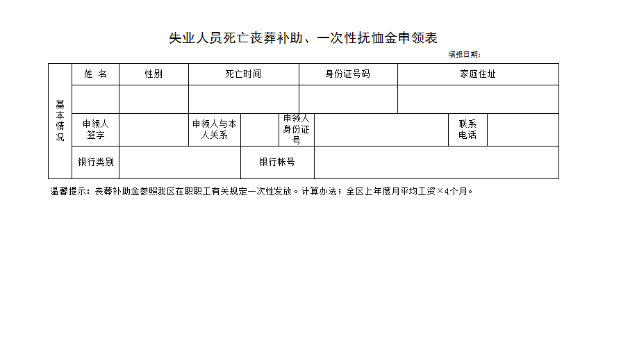 失业人员死亡丧葬补助一次性抚恤金申领表
