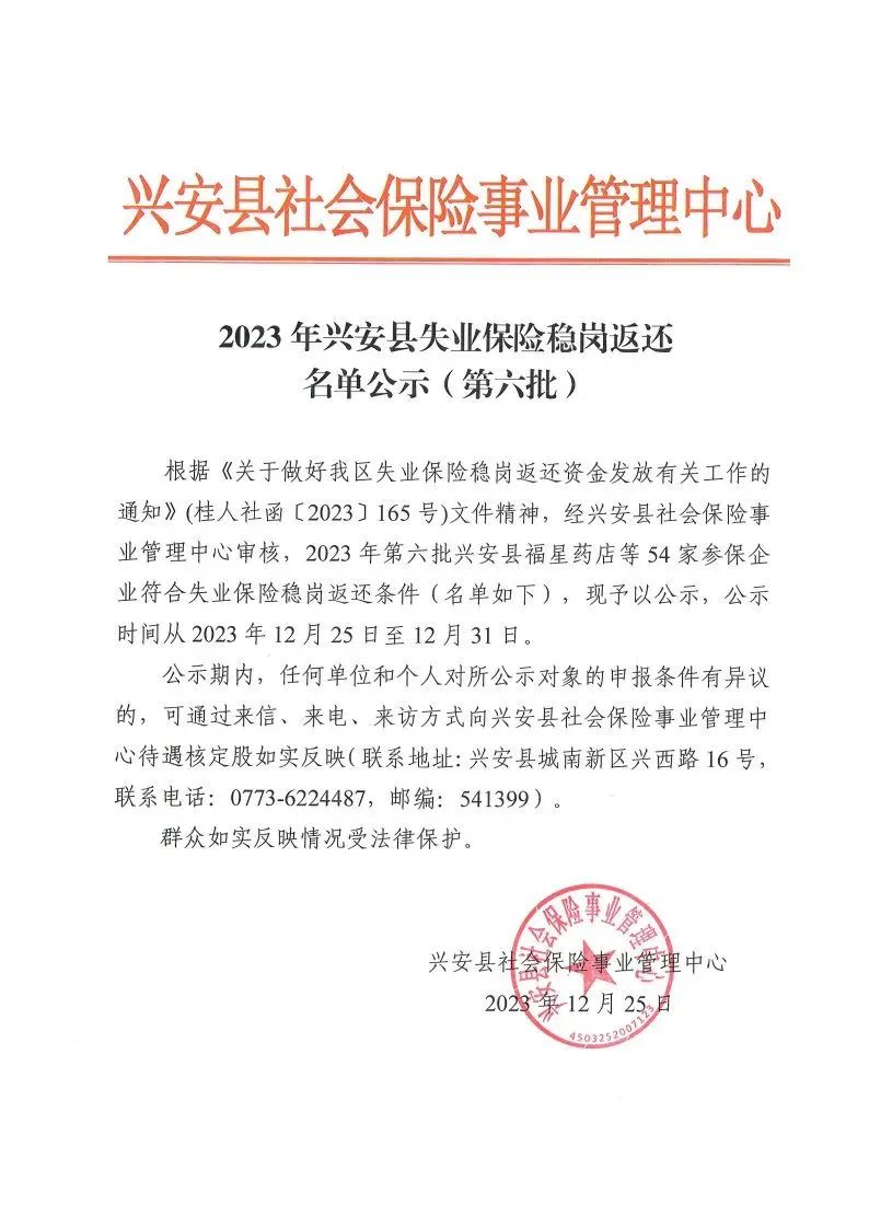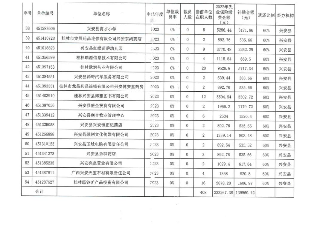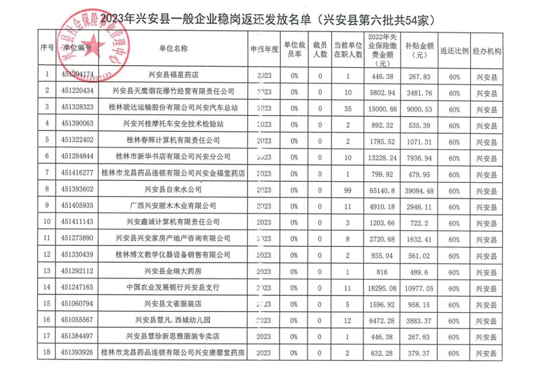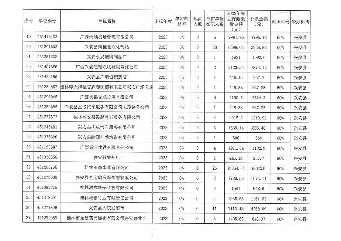 2023年兴安县失业保险稳岗返还名单公示(第六批)