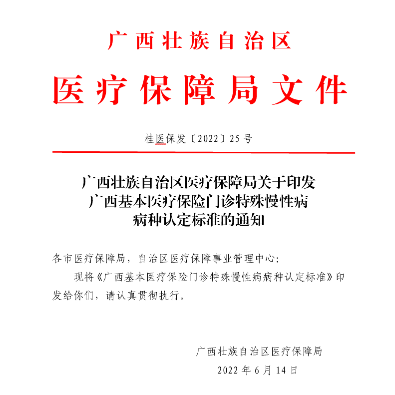 桂医保发〔2022〕25号 广西壮族自治区医疗保障局关于印发广西基本医疗保险门诊特殊慢性病病种认定标准的通知.pdf