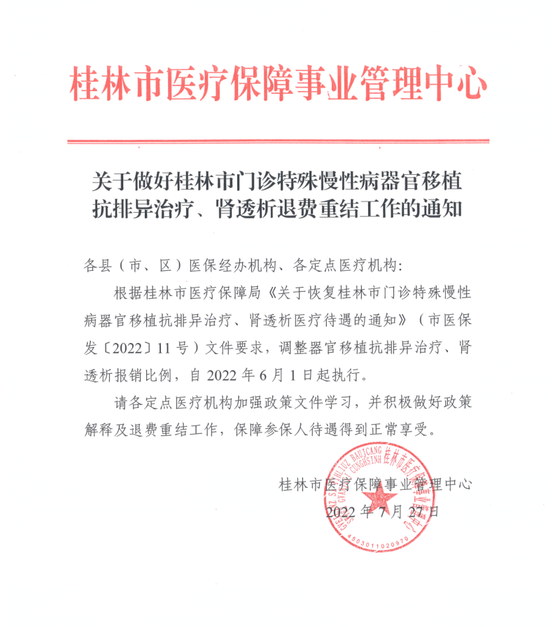 市医保发〔2022〕11号 关于恢复桂林市门诊特殊慢性病器官移植抗排异治疗、肾透析医疗待遇的通知.pdf