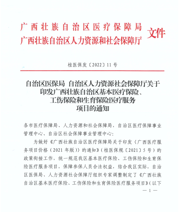 自治区医保局自治区人力资源社会保障厅关于印发广西壮族自治区基本医疗保险工伤保险和生育保险医疗服务项目的通知