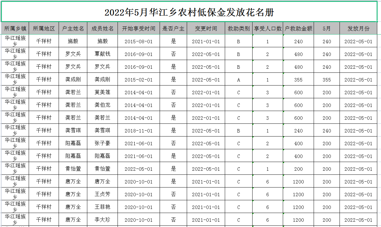 2022年5月华江乡农村低保金发放花名册