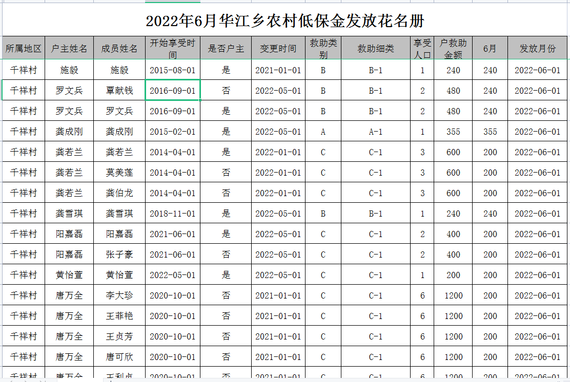 2022年6月华江乡农村低保金发放花名册
