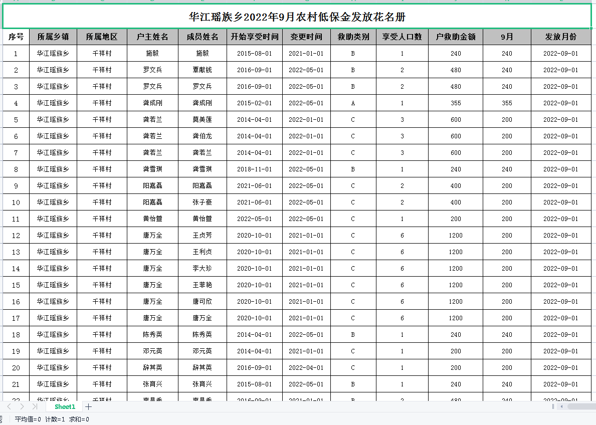 华江瑶族乡2022年9月农村低保金发放花名册.xlsx