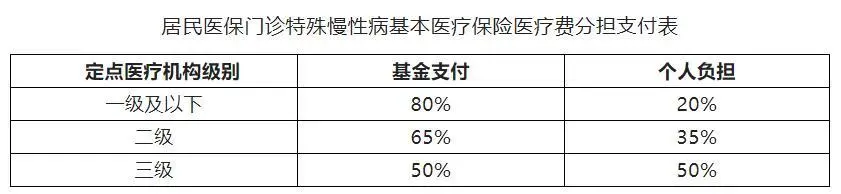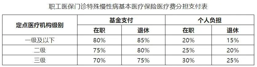 答:门诊特殊慢性病患者在定点医疗机构门诊发生符合门诊特殊慢性病支付范围的医疗费用,居民医保和职工医保由统筹基金分别按以下比例分担支付。
