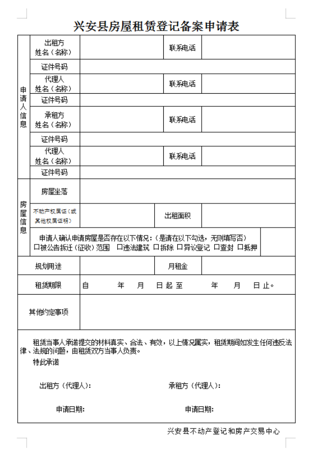 兴安县房屋租赁登记备案申请表