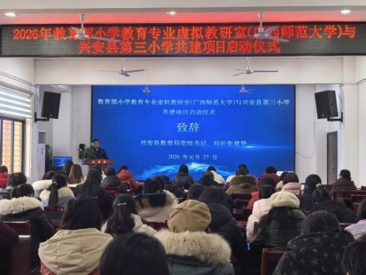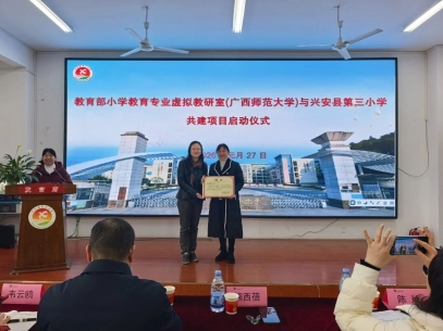 仪式上,广西师范大学教育学部副部长熊西蓓教授与兴安县第三小学校长张丽荣共同完成了“教育部小学教育专业虚拟教研室基地校”聘书颁发。未来,高校将通过虚拟教研室平台,在课程开发、师资培养、教研创新等方面为基地校提供持续的专业支持与引领。