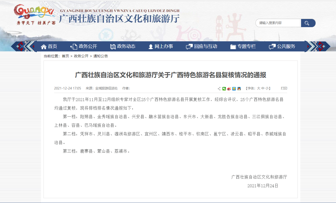 近日,广西文化和旅游厅公布了《关于广西特色旅游名县复核情况的通报》,其中,兴安县位列第一档!通过广西特色旅游名县复核。