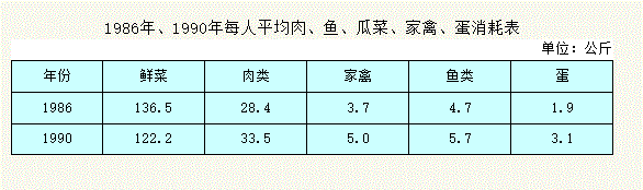 1986年、1990年每人平均肉、鱼、瓜菜、家禽、蛋消耗表