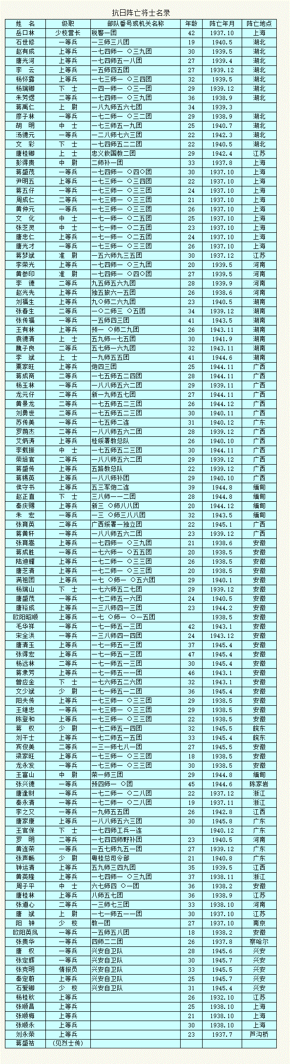 附:抗日阵亡将士名录1937年7月7日~1945年9月2日抗日战争时期,国民党军队中兴安籍官兵在对日作战中阵 亡人员共110名。