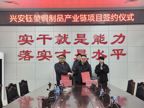 2024年3月2日,兴安县与桂林胖阿姨秦皇餐饮管理有限公司签署了兴安桂林米粉产业科技赋能创新基地投资协议;与广西钰堃金属科技有限公司签署了兴安钰堃铜制品产业链项目投资协议。