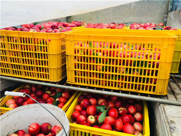 果农陈梅说:今年产量是最好的,是丰收的,果树大,天气好,如果天气不好就花开的不行,还要人工管理好,预计收入达到四五万吧,(删)这个是玫瑰红,它的口感是非常甜的,加上在山上气候也好,也很甜也很脆的口感,市场销售是最好的,这个桃子销路很好比其他的桃子受欢迎,顾客们吃了回率很高。