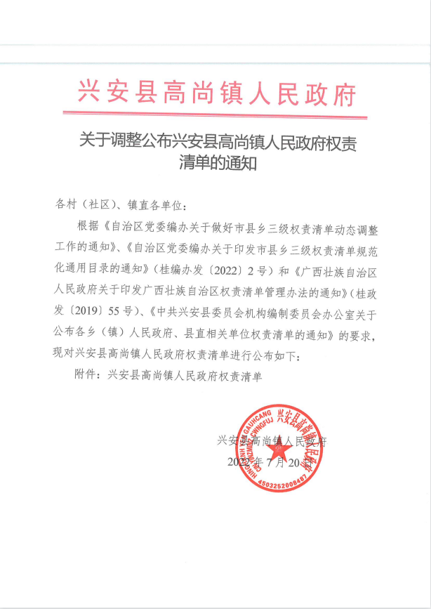 关于调整公布兴安县高尚镇人民政府权责清单的通知