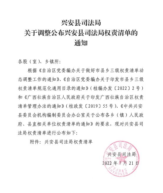 兴安县司法局关于调整公布兴安县司法局权责清单的通知