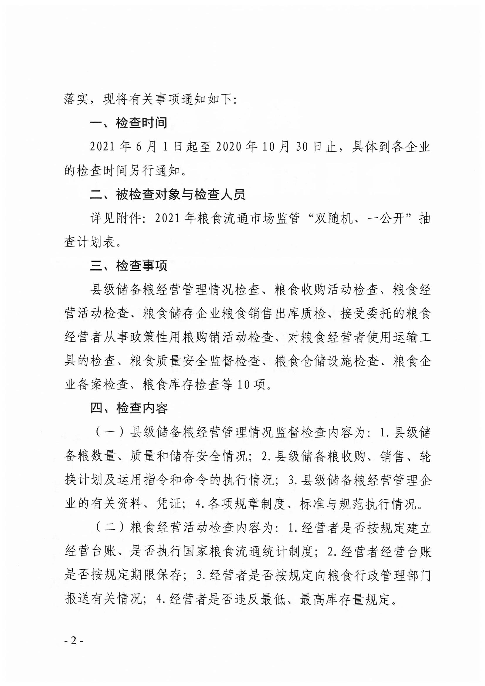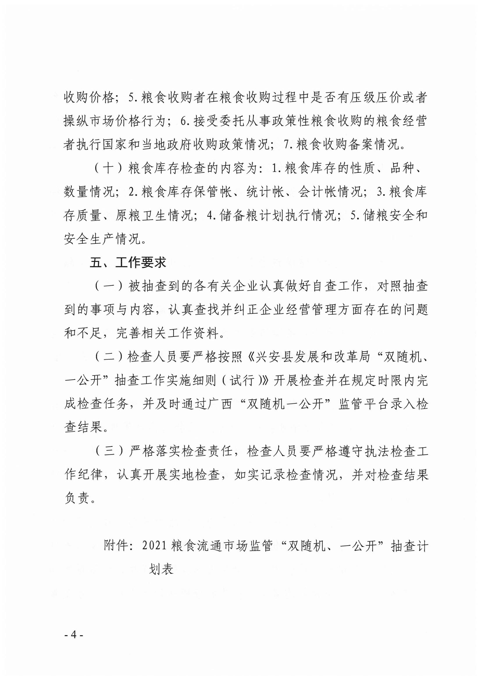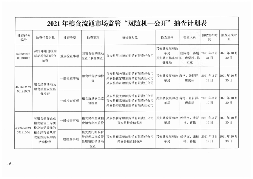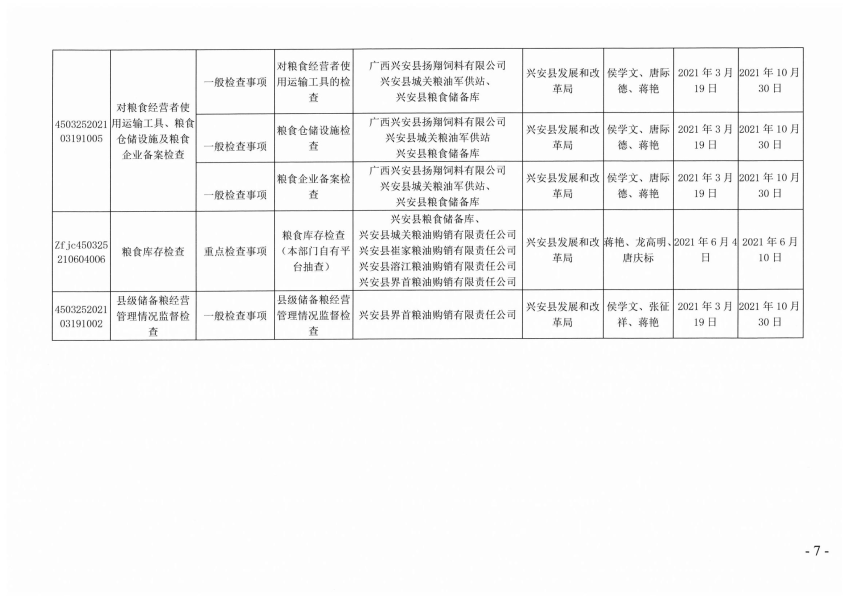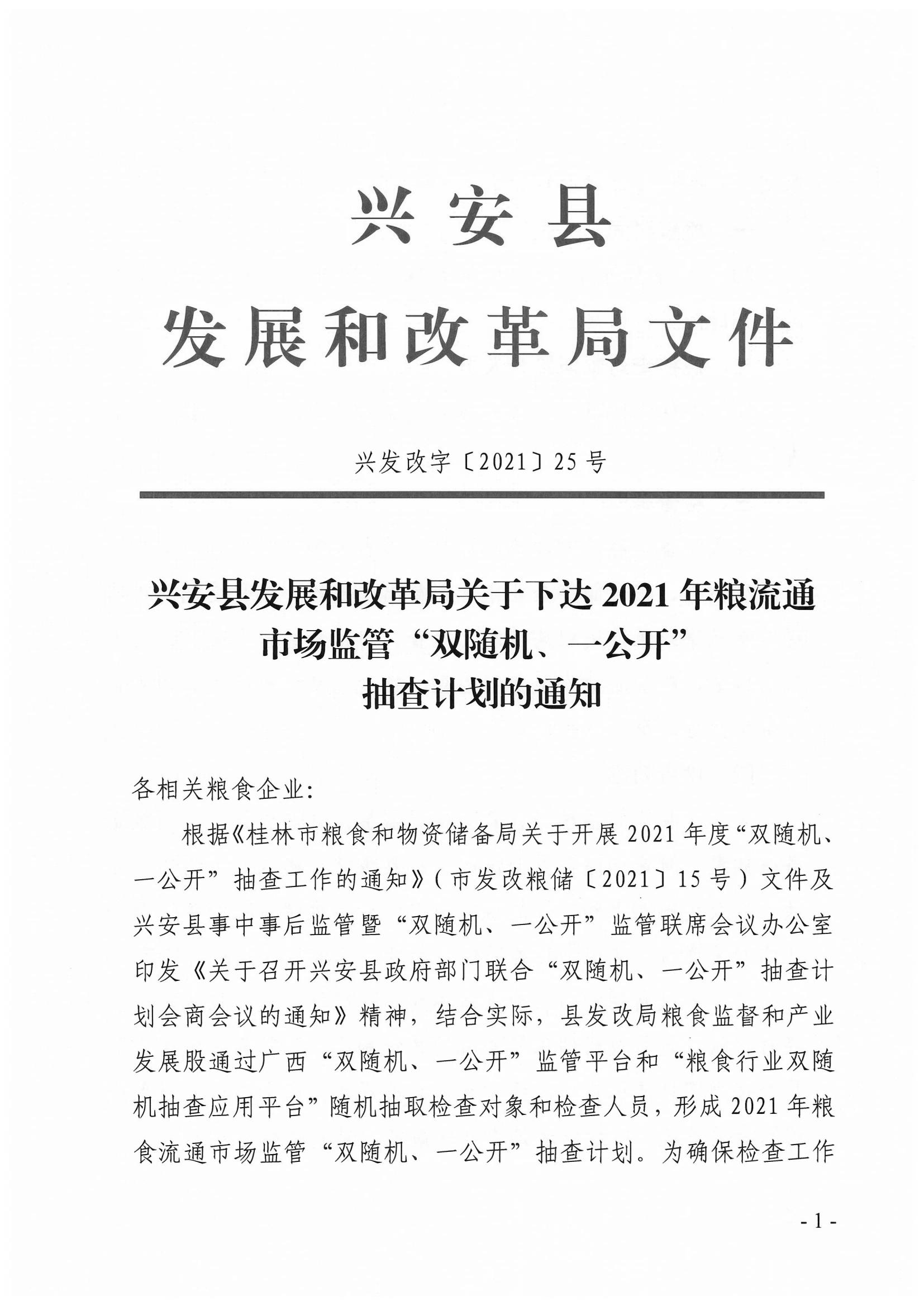 兴安县发展和改革局关于下达2021年粮食流通市场监管“双随机、一公开”抽查计划的通知