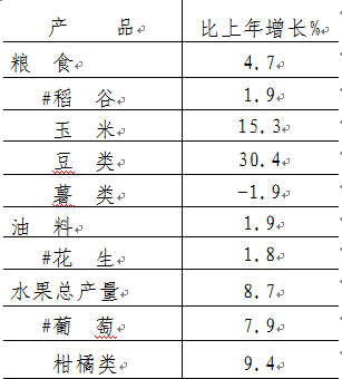 全年粮食作物播种面积同比增长3.0%;经济作物播种面积增长2.7%;其他农作物播种面积增长1.2%。全年粮食总产量同比增长4.7%。水果总产量同比增长8.7%;蔬菜产量增长5.2%。