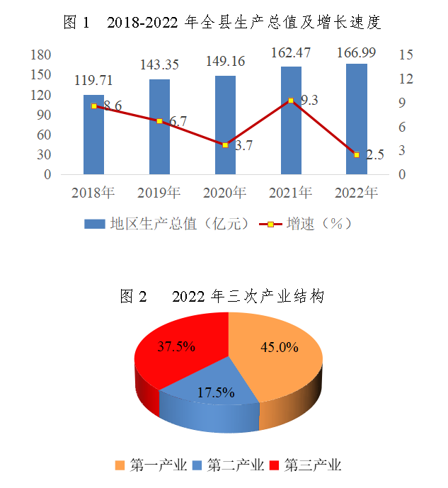 初步核算,全年全县生产总值(GDP)166.99亿元,按可比价计算,同比增长2.5%。