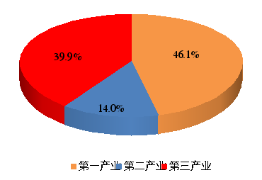 分产业看,第一产业增加值79.15亿元,同比增长4.0%;第二产业增加值24.03亿元,同比增长1.3%;第三产业增加值68.44亿元,同比增长4.8%。三次产业增加值占地区生产总值的比重分别为46.1%、14.0%和39.9%,对经济增长的贡献率分别为47.8%、6.1%和46.1%。按常住人口计算,全年人均地区生产总值56095元,比上年增长4.2%。
