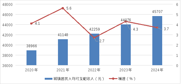 图2 2020-2024年城镇居民人均可支配收入及增长速度