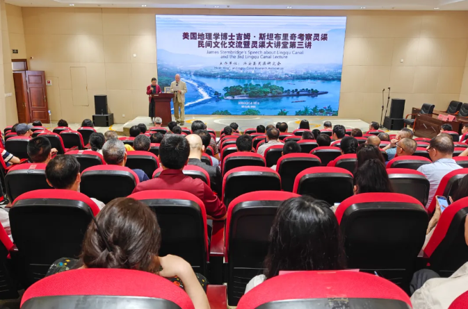 随后,吉姆·斯坦布里奇博士来到灵渠博物院报告厅,参加了由兴安县灵渠研究会主办的“灵渠大讲堂”第三讲,并作了主题为《灵渠与世界历史》的精彩演讲。