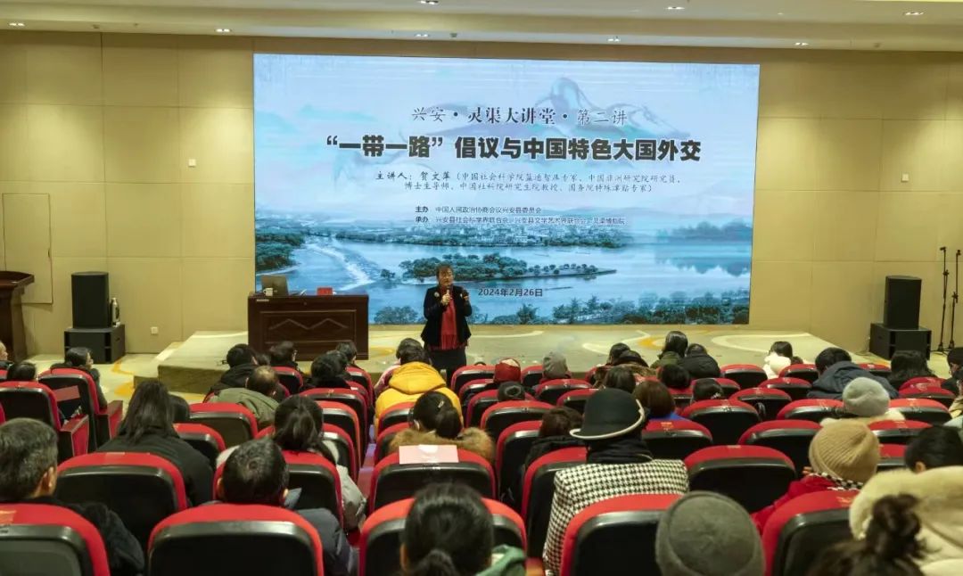 县政协主席庄慧琼出席活动并致辞,县政协副主席刘丽主持专题讲座。中国社科院蓝迪智库专家、中国非洲研究院研究员、博士生导师、中国社科院研究生院教授、国务院特殊津贴专家贺文萍应邀作“灵渠大讲堂——‘一带一路’倡议与中国特色大国外交”专题讲座,我县各乡(镇)、县直各单位、上级驻兴各单位相关负责人,县社科联、县文联、灵渠博物院等主要负责人及全体人员,县文广体旅局二层机构及县文旅投公司等相关人员,县政协文史研究员,县社科联管理的下属学会会员和县文联管理的下属协会会员参加活动。