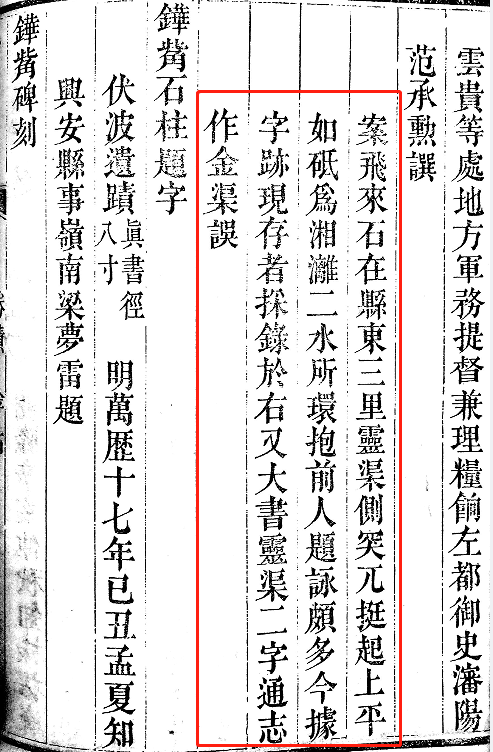 素以考据严谨著称的唐兆民先生对于该条文中“金渠”之说,依乾隆《兴安县志》及嘉庆《广西通志》作了深入考订论证,认为因飞来石体积不大且早已刻满了前人之作,于是查礼命人铲掉了原有的‘金渠’重题‘灵渠’二字,现‘灵渠’摩崖处即原题刻‘金渠’处。