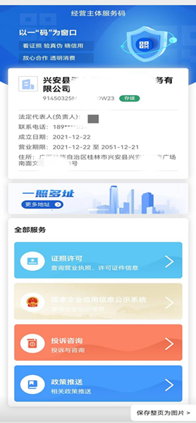 开展“一企一照一码”改革后,企业群众只需扫描营业执照经营主体服务码,即可查看其关联的许可电子证照信息,不仅可以方便企业在办事时线上申请材料、减少线下奔波,而且提高了企业信息透明度,促进企业规范经营,有利于营造更加真实、透明的交易环境。截至目前,已首批关联上线食品经营许可、药品经营许可、医疗器械网络销售备案等10项高频涉企许可电子证照信息,真正实现“一次赋码、一码通查”。