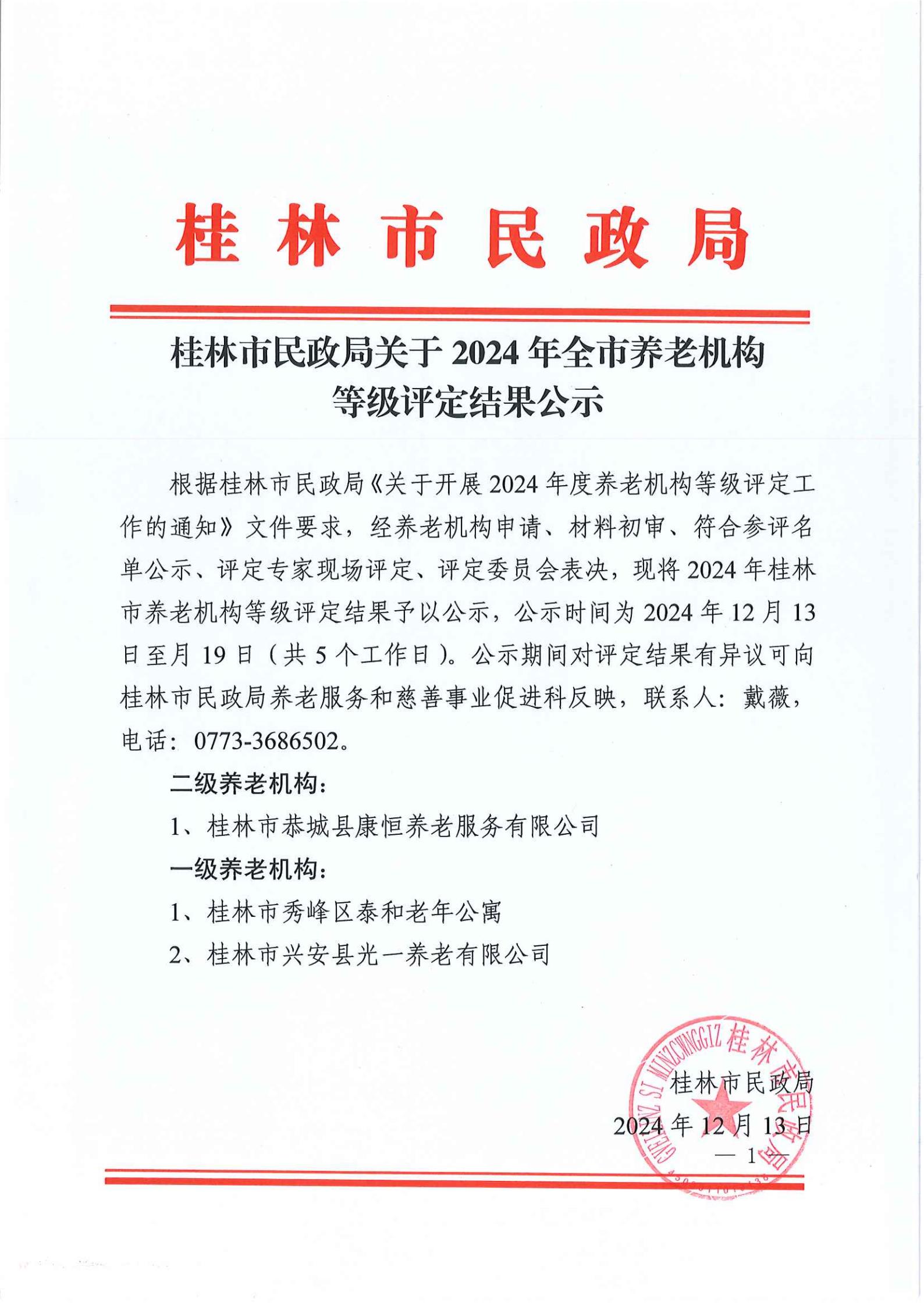 市民政局关于2024年全市养老机构等级评定结果公示