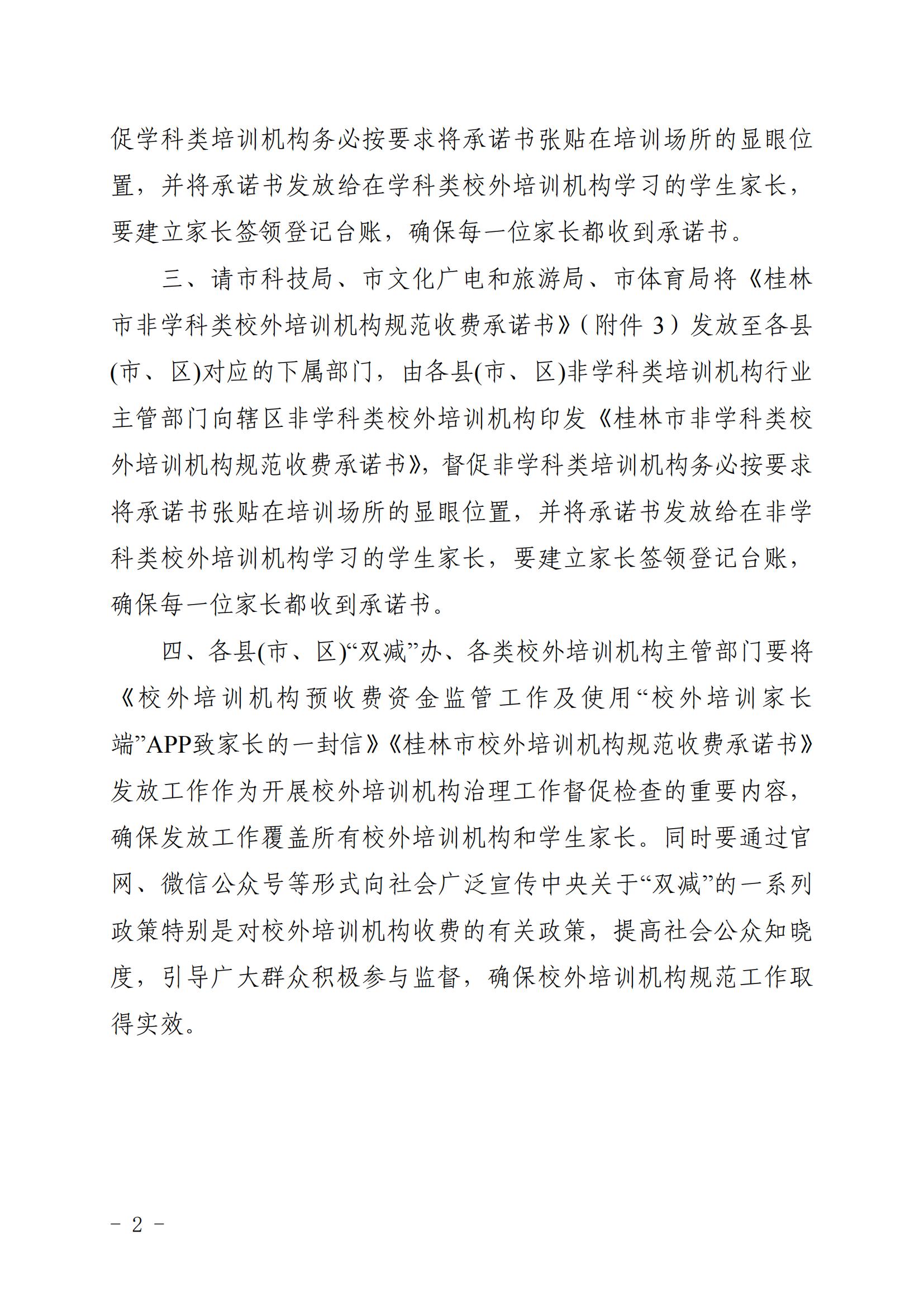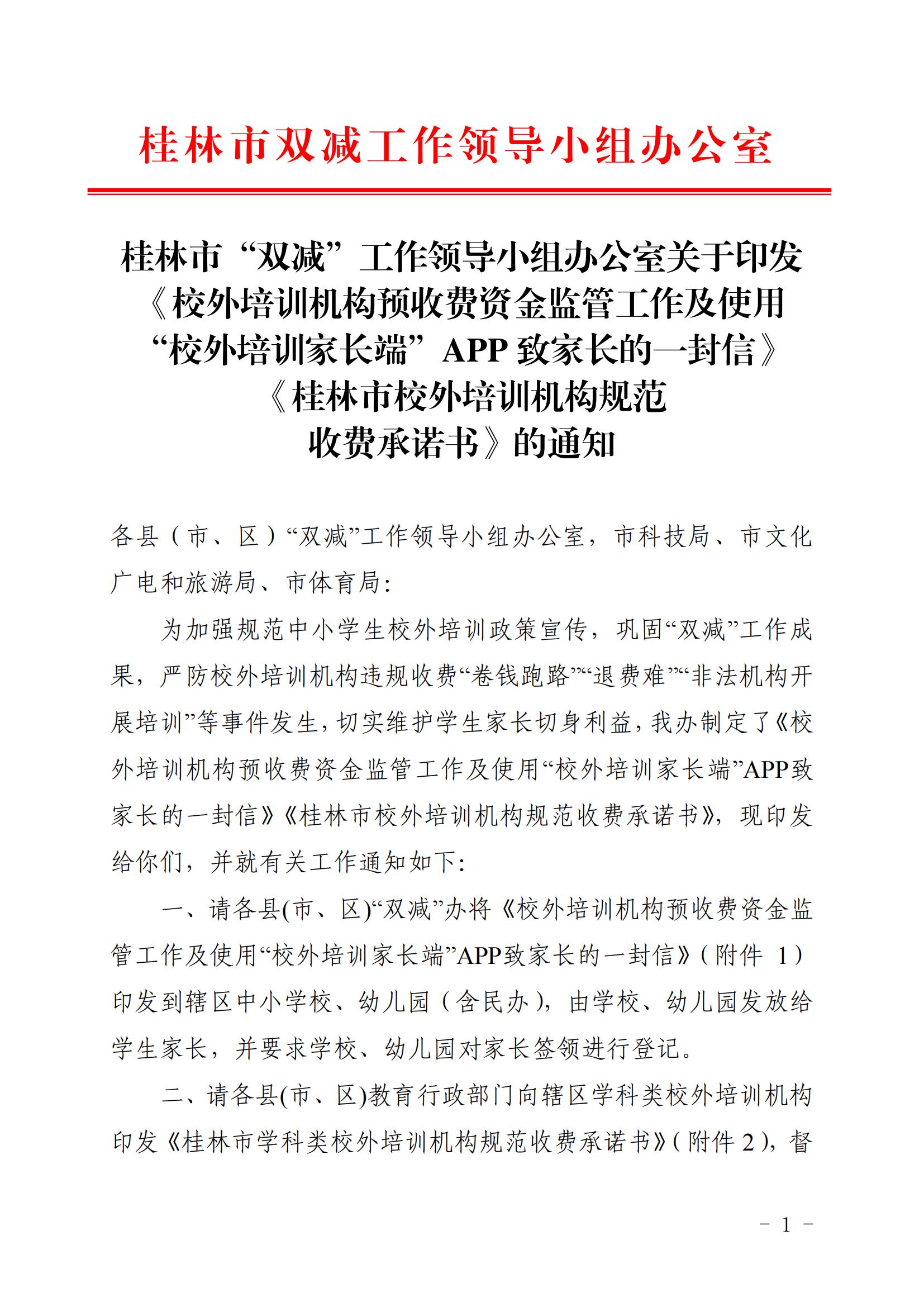 桂林市“双减”工作领导小组办公室关于印发《校外培训机构预收费资金监管工作及使用“校外培训家长端”APP 致家长的一封信》《桂林市校外培训机构规范收费承诺书》的通知