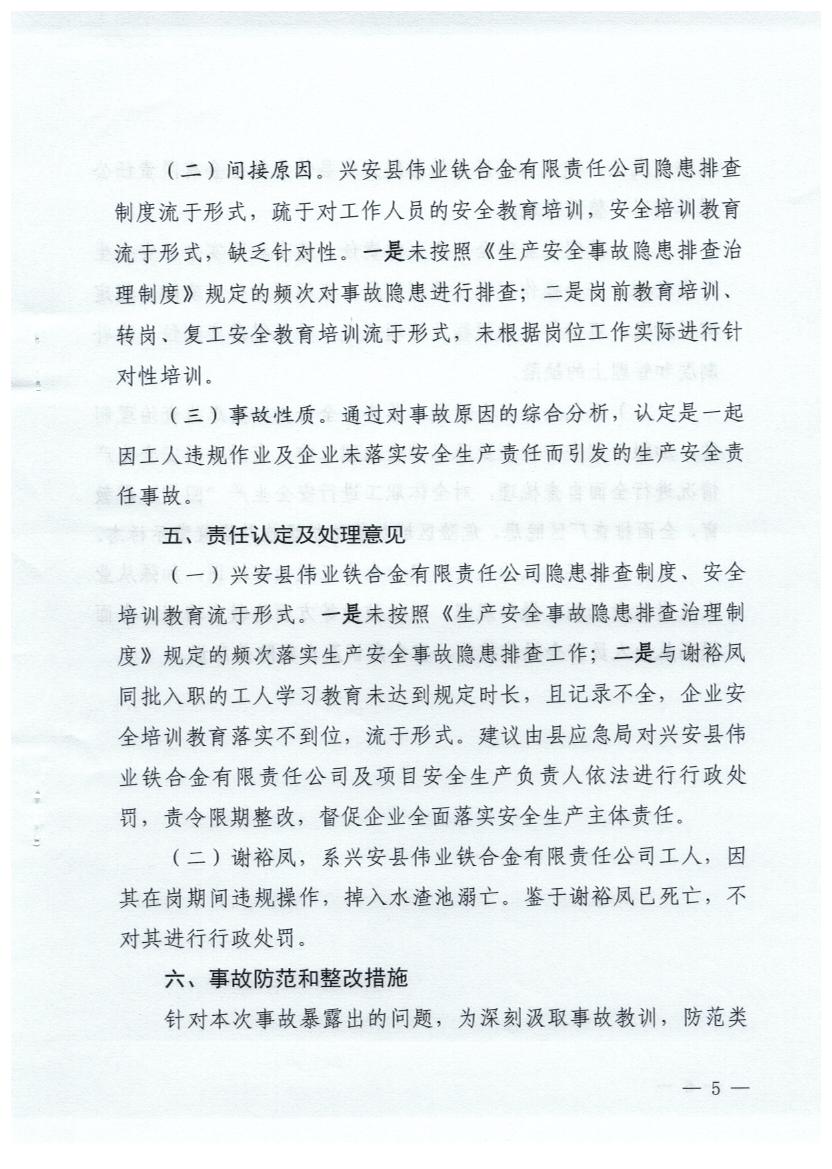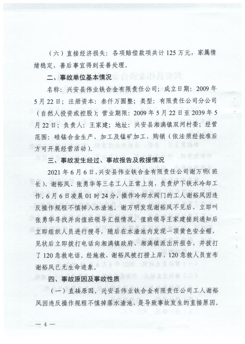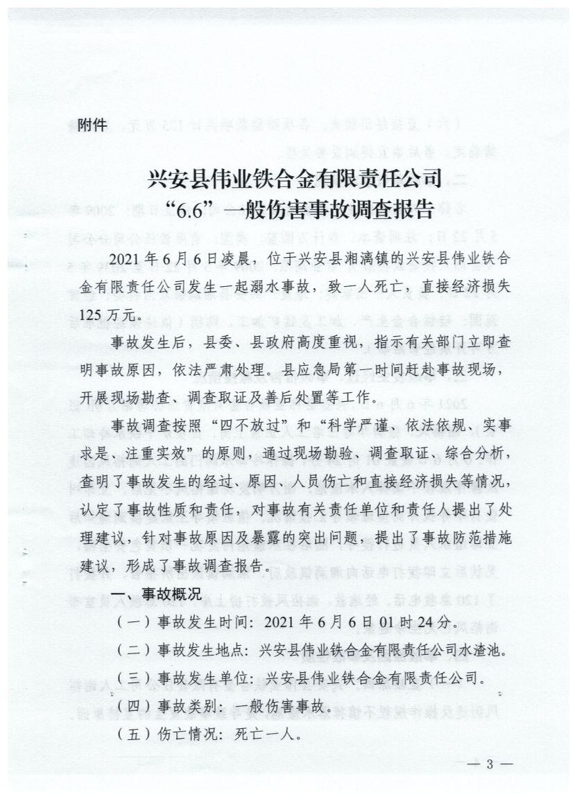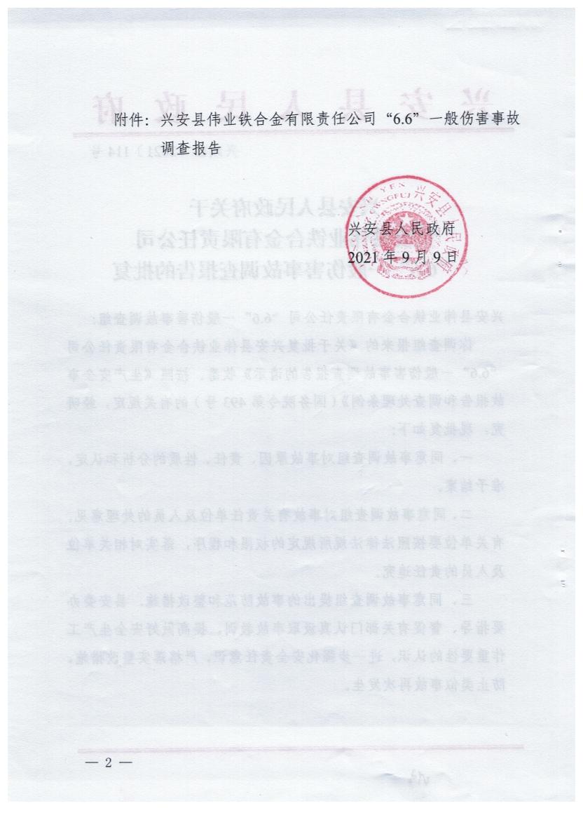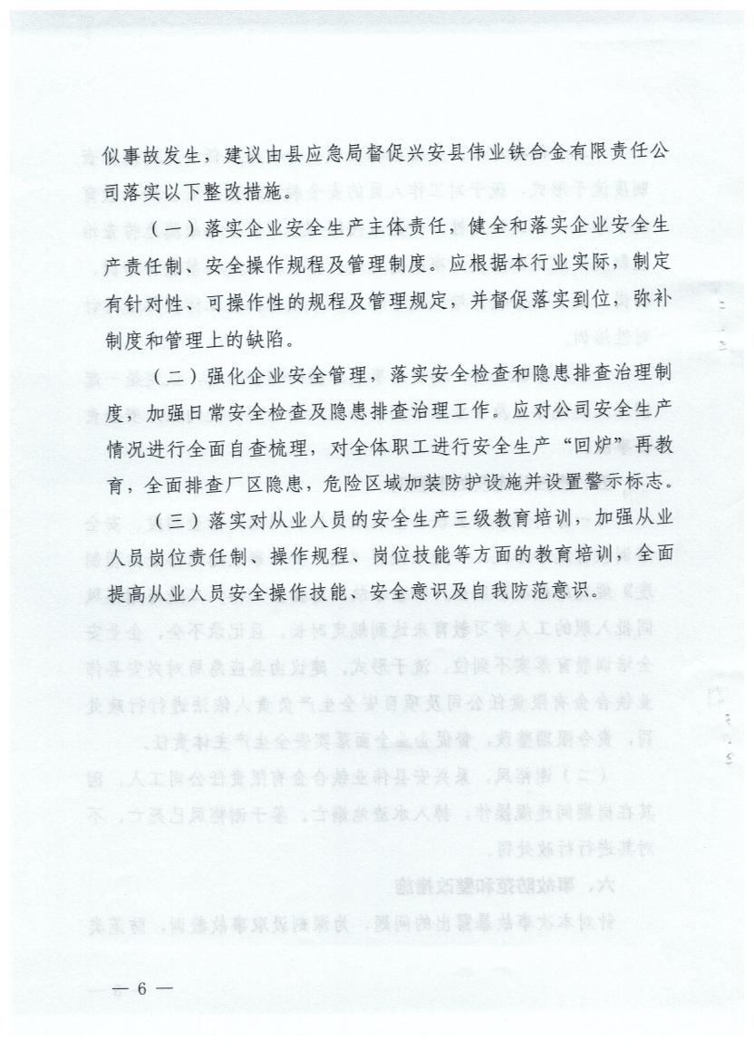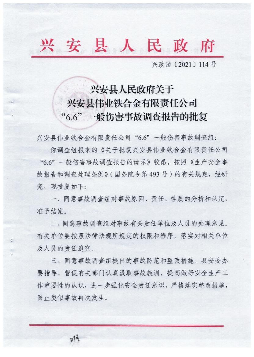 兴安县人民政府关于兴安县伟业铁合金有限责任公司“6·6”一般伤害事故调查报告的批复