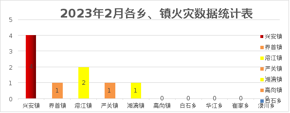 (一)各乡、镇火灾情况。2023年2月,兴安县各乡、镇火灾起数分别为兴安镇4起,占火灾总数的44%;溶江镇2起,占火灾总数的22%;湘漓镇、界首镇、严关镇各1起,分别占火灾总数的11%。(详情见附件)