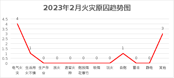 (二)按起火原因分析。2023年2月,电气火灾类4起,占火灾总起数的44%;生活用火不慎类火灾1起,占火灾总起数的11%;自燃火灾1起,占火灾总起数的11%;其他火灾3起,占火灾总起数的33%。