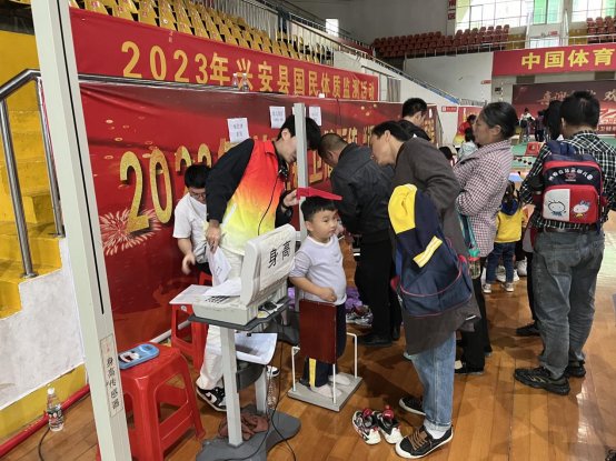 桂林市兴安县从2023年10月8日开始至2023年10月13日为期6天的监测活动,监测活动按照国民体质测定标准对幼儿(3-6周岁)、成年人(20-59周岁)、老年人(60-69岁)进行了身体形态、身体机能和身体素质等三个方面监测。其中,幼儿组监测项目包括身高、体重、坐高、安静心率、走平衡木、双脚连续跳等项目;成人组体质测试包含了身高、体重、血压、脉搏、肺活量、握力、选择反应时、闭眼单脚站立、坐位体前屈、俯卧撑(男)、仰卧起坐(女)、台阶试验等测试。