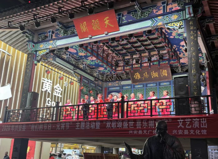 夜幕降临,华灯初上。兴安县文化馆筹备的“欢歌颂盛世 喜乐闹元宵”文艺演出在兴安古戏台华彩开演。全县文艺骨干与民间艺人轮番登场,红火歌舞跳出兴安人的精气神,桂剧、彩调等地方戏曲经典唱段婉转悠扬,既有时代新意,又满含家乡韵味,让市民在古戏台下过足戏瘾,在欢歌乐舞中感受盛世元宵的热闹氛围。