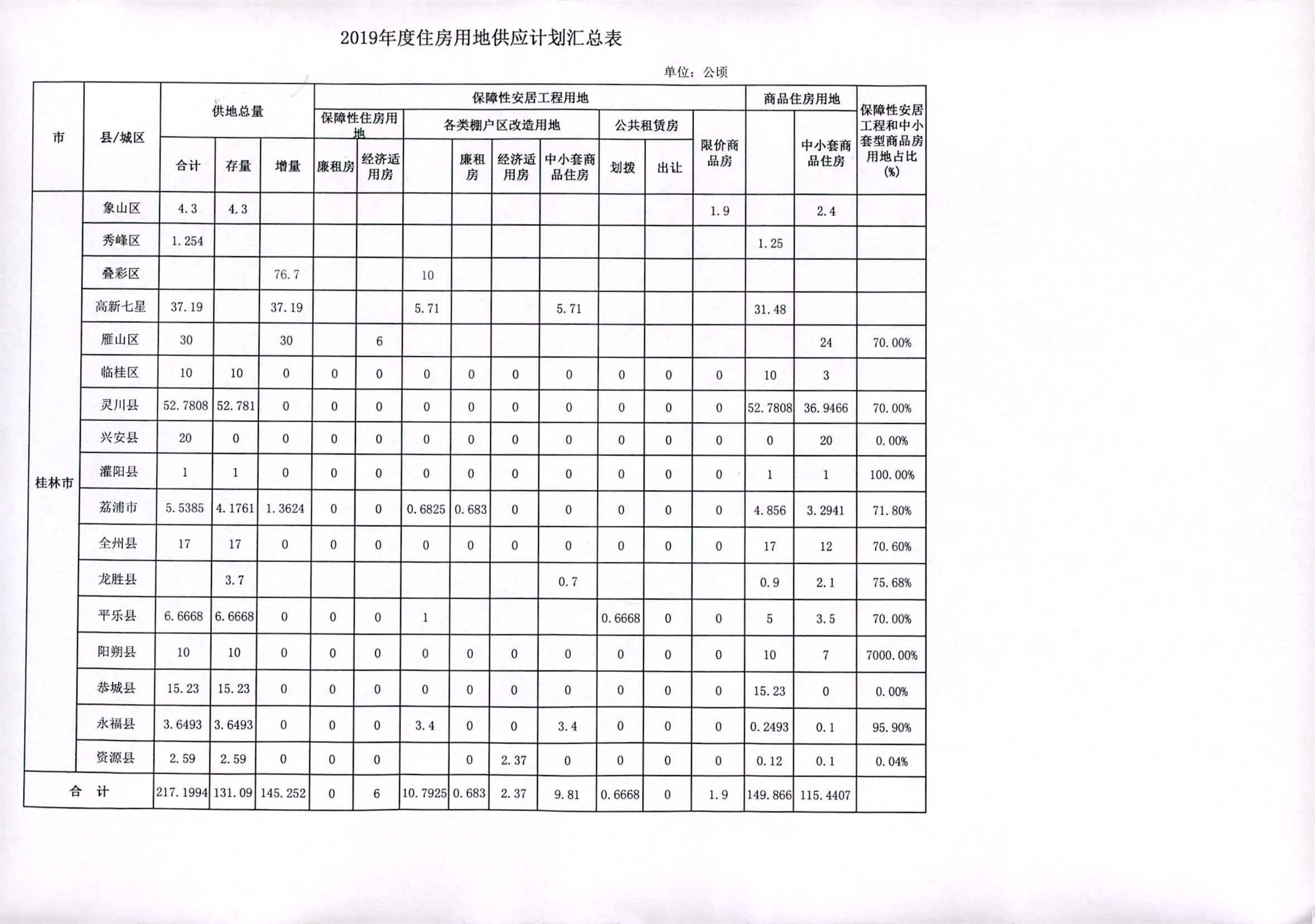 2019年桂林行政辖区内住房用地计划