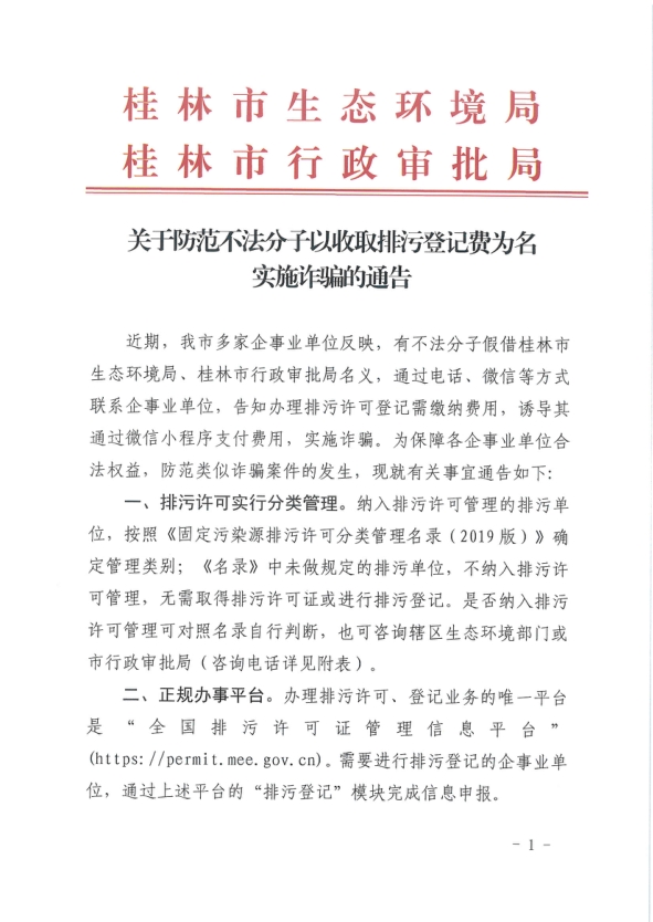 关于防范不法分子以收取排污登记费为名实施诈骗的通告